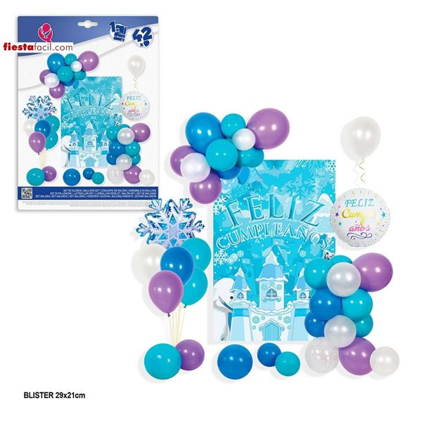 SET DE 42 GLOBOS CON CARTEL 120X68CM FELIZ CUMPLE PRINCESA HELADA AZULES Y LILA