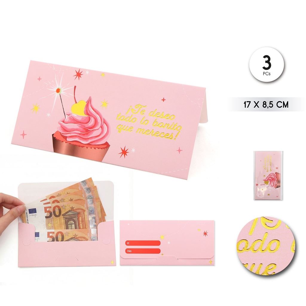 El pack de 3 sobres regalo “Te deseo todo lo bonito que mereces” es una forma elegante y original de entregar dinero o una tarjeta en cumpleaños y celebraciones especiales. Con diseño en color rosa y detalle de cupcake, es perfecto para acompañar un regalo con un mensaje bonito y especial.