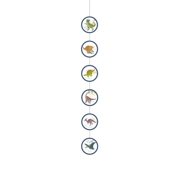 4 Tiras colgantes de cartón para decorar una fiesta de dinosaurios. Contiene 4 tiras de 1,30 metros de largo con troquelados de cartón impresos por ambas caras de 13cm de diámetro.