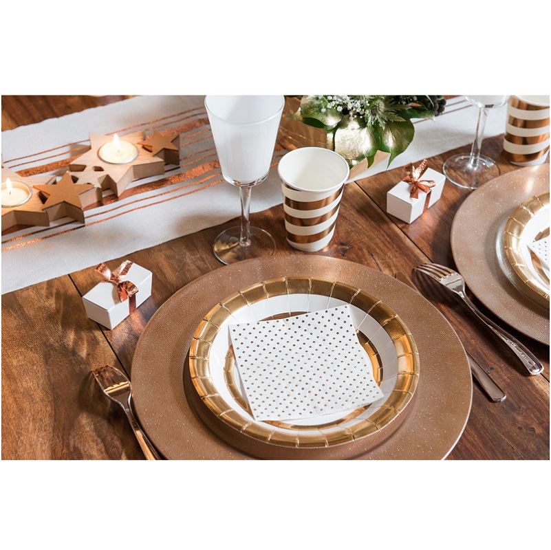 Vasos de cartón de muy buena calidad con unas rayas doradas metálicas en espiral en un fondo blanco, un vaso divertido y elegante. Capacidad 266ml. Contiene 10 unidades