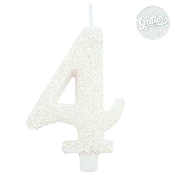 Vela del número 4 de color blanco de 9.5cm de alto. Celebra tu cumpleaños con esta maravillosa y original vela. Ideal para fiestas infantiles y de adultos. Combina tu vela de color blanco con nuestra vajilla lisa y sus complementos de ese mismo tono.