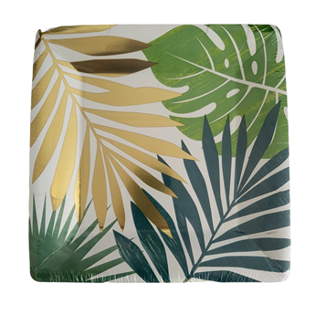 8 platos de papel de 23 cm con forma hexagonal. Este conjunto está adornado con animales y un delicado paisaje tropical. Los platos vienen en el paquete en los dos colores de fondo: blanco y negro. Los platos de Tropical Jungle respetan el medio ambiente: Han obtenido la Certificación Aticelca y por tanto son reciclables en papel.