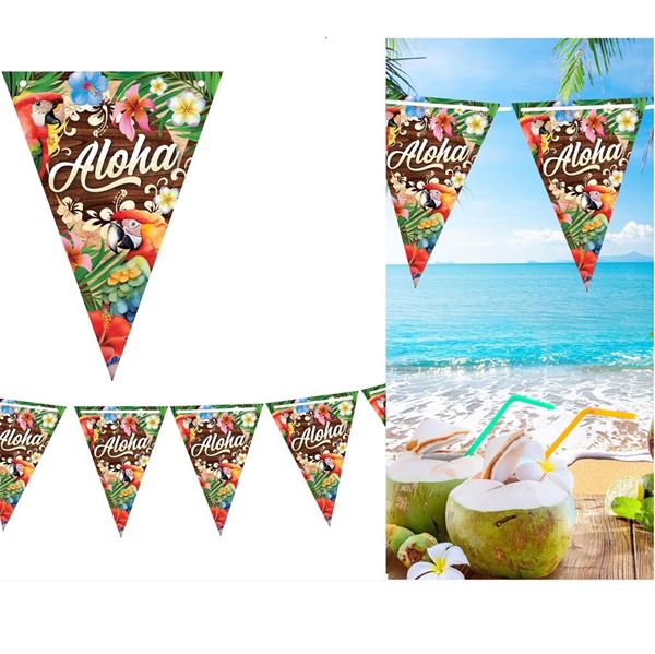 Original y bonito banderín gigante de plastico para una fiesta temática Hawaiana, es un precioso banderín que viene genial para decorar grandes espacios, colores muy bonitos y brillantes. Mide aprox cada banderín 45cm x 30cm. Y de largo 6 metros.