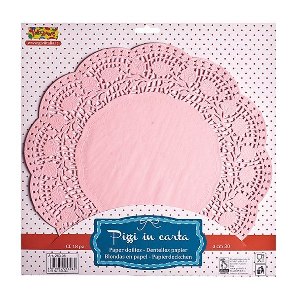 30 blondas de papel con el borde troquelado color rosa. Con una medida de 21.5cm. Un complemento perfecto para tus platos, bases de tartas, Candy Bar.