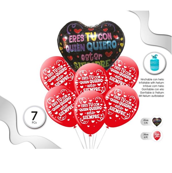 Sorprende a tu pareja o ser querido con este set de globos románticos. El pack incluye 7 globos decorativos: 1 globo de foil en forma de corazón (45 cm) y 6 globos de látex rojos (30 cm) con el mensaje "Eres tú con quien quiero estar siempre". Perfectos para celebrar San Valentín, aniversarios o cualquier ocasión especial para demostrar tu amor.