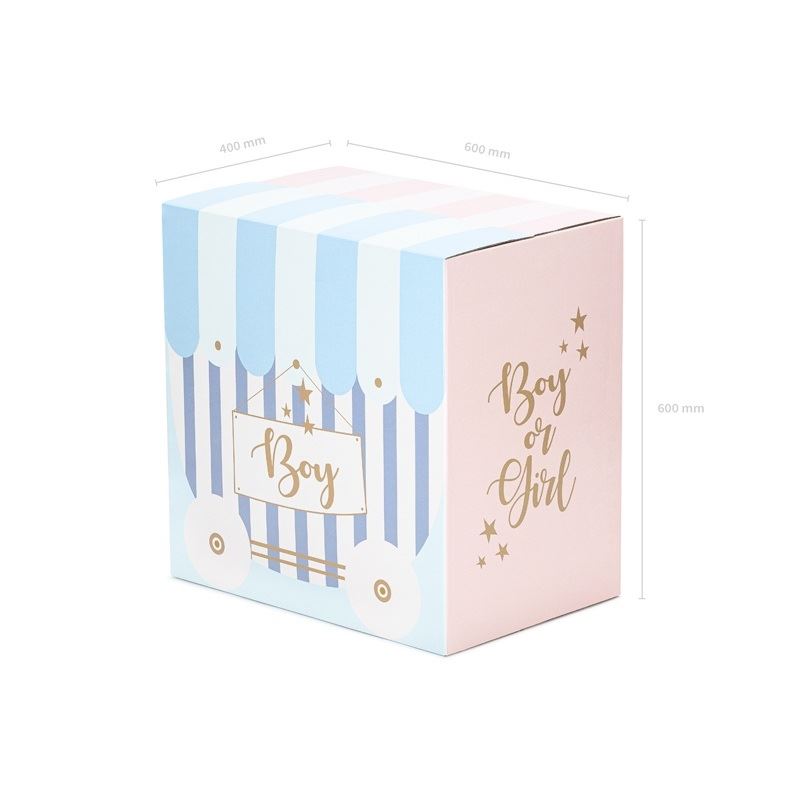 La caja sorpresa de globos Boy or Girl 60 x 40 x 60 cm es el complemento perfecto para fiestas de revelación de género. Diseñada con un estampado en tonos rosa y azul y el mensaje “Boy or Girl”, esta balloon box crea un efecto sorpresa espectacular al abrirla y dejar salir los globos.
