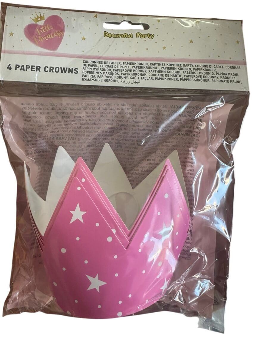 Las coronas de papel Little Princess con goma (pack 4 uds) son el complemento perfecto para cumpleaños infantiles y fiestas temáticas de princesas. Diseñadas en color rosa con detalles de estrellas, convierten a cada invitada en la protagonista del día de forma sencilla y divertida.
