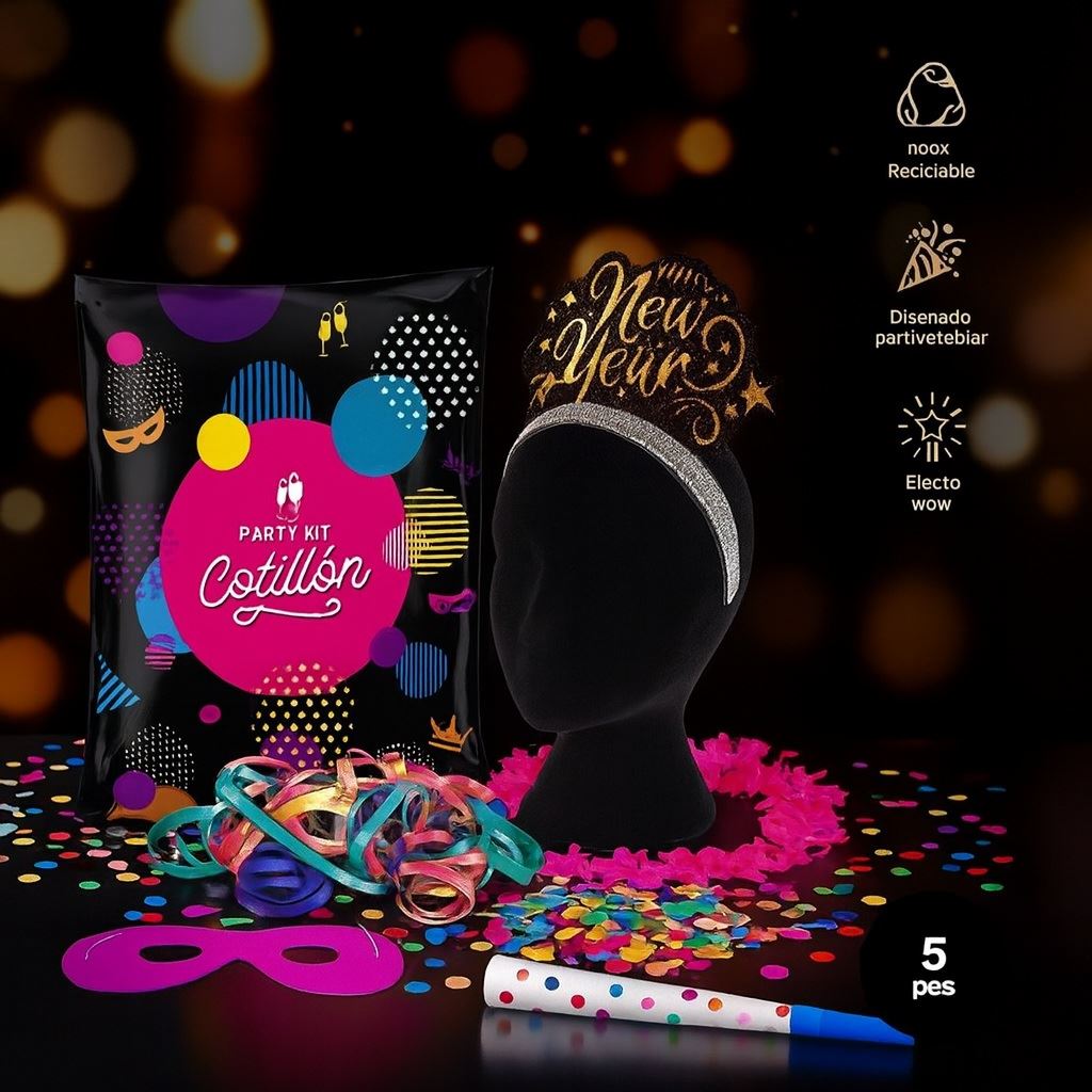 Bolsa de cotillón para fiestas. Incluye 8 accesorios: -1 gorro (modelo surtido), -1 antifaz -2 serpentinas, -1 nariz de plástico de payaso -1 collar -1 pito con flecos . -1 dientes vampiro Imprescindible en las fiestas de Nochevieja, cumpleaños y eventos. Cotillón Nochevieja Bolsa Completa para Animar tus Fiestas 🎉 Despide el año por todo lo alto con este cotillón de Nochevieja en bolsa, ideal para mantener viva la tradición y llenar tu celebración de diversión. Este set incluye todo lo necesario para que cada invitado participe en la fiesta con accesorios que garantizan momentos inolvidables. Haz que la transición al nuevo año sea única con este cotillón completo y alegre. ¡Un básico imprescindible para tus celebraciones de fin de año! 🎊