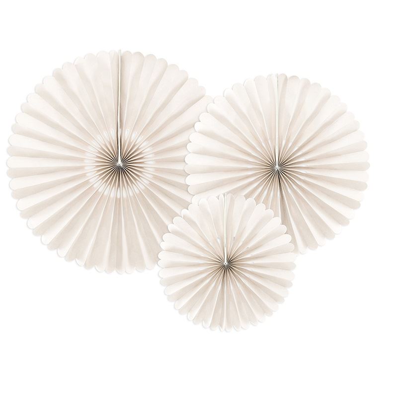 Preciosos abanicos de papel en color beige claro. Estos abanicos son perfectos para decorar cualquier tipo de celebración, comuniones, bautizos, baby showers, verano o bodas. Paquete de 3. En 3 tamaños diferentes. Un abanico mide aprox. 26cm, otro de 34cm y por último uno de 43cm de diámetro.