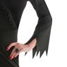 Un clásico disfraz de bruja en negro, incluye un vestido con escote en V, falda rematada en picos, y mangas rematada en picos. No incluye sombrero ni escoba.