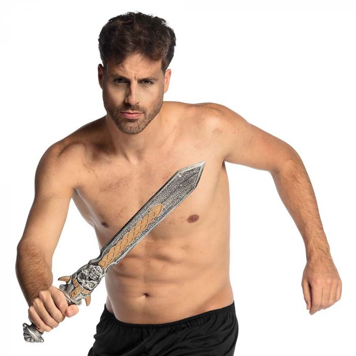 Espada de guerrero con calaveras en dorado y plateado. No le falta detalle para ser el mejor accesorio de un guerrero oscuro, para una fiesta de disfraces o Halloween. Mide aprox 57cm