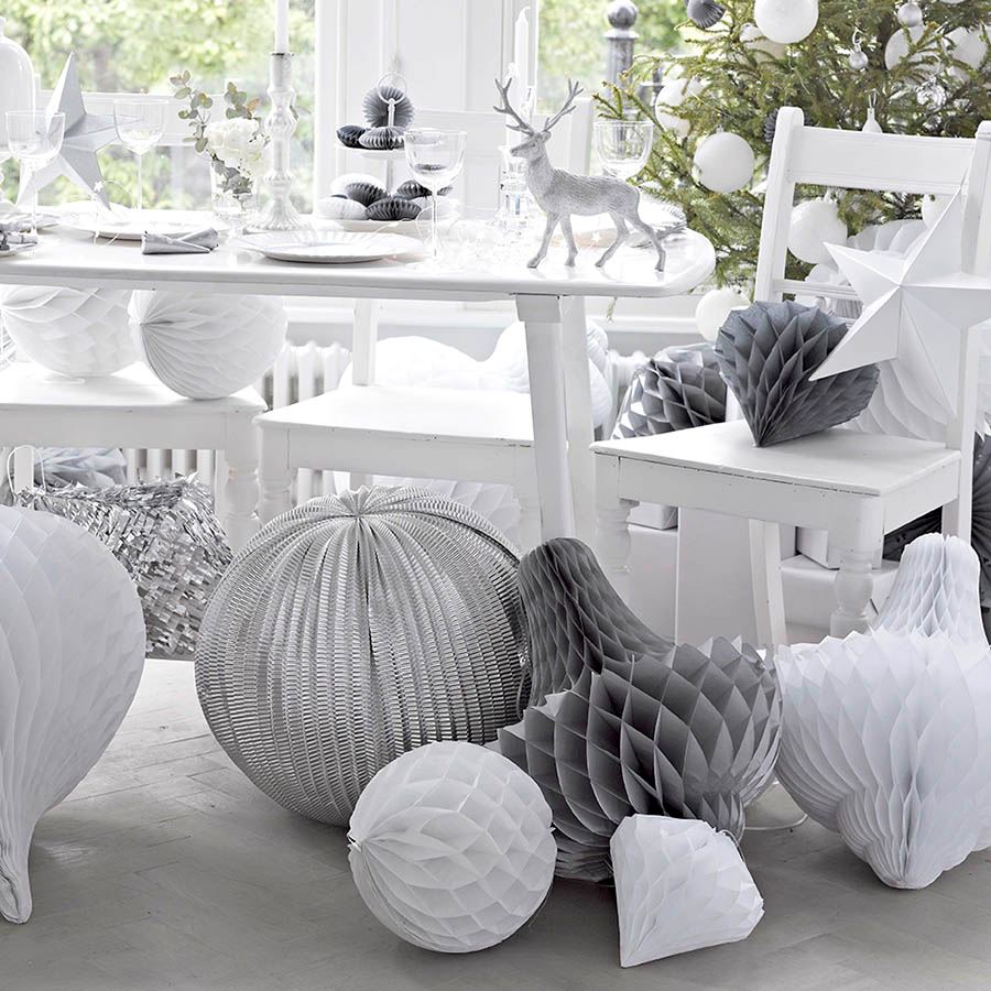 El paquete incluye un farolillo blanco mate de 20cm, un farolillo gris mate 25,4cm, y un farolillo plata metalizado de 30,5cm.