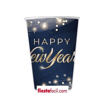 Vasos de cartón de alta calidad de diseño italiano de color negro con puntos dorados y la frase la frase "Happy New Year" en tono dorado que hace que el plato quede muy elegante en la mesa de fin de año o en la comida de año nuevo y les encante a tus invitados y familiares. 250ml. 8 vasos