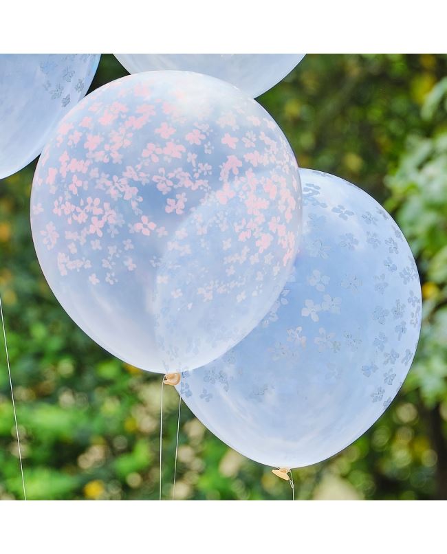 5 Globos de látex transparentes espectaculares y elegantes. Contiene globos transparentes de 30cm con estampado floral en globos florales pastel amarillos, rosas y azules. Una delicia de globos, para inflar con Helio o aire.
