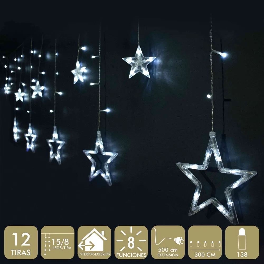 Guirnalda de luces led blancas para interior o exterior con forma de estrellas. Traen 12 tiras de leds con una estrella al final. Hay 25cm entre filas. Las tiras largas traen 15 leds (5 leds la tira y 10 leds la estrella). Las tiras cortas traen 8 leds (3 leds la tira y 5 la estrella). Mide 300cm de ancho y 100cm de alto. En total son 138 leds de iluminación. Se alimenta con la red eléctrica a través de un transformador de 20mA, 1.5V (Incluído). Tiene 8 funciones de iluminación. Es ideal para cualquier escenario navideño.