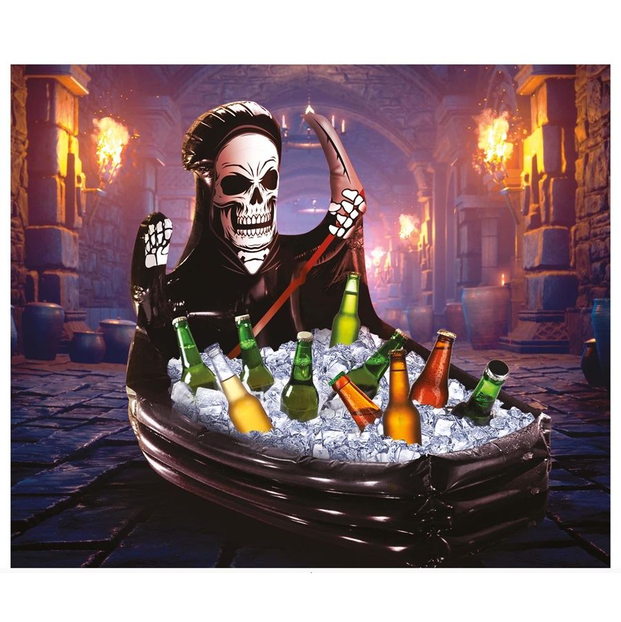 Sorprende a tus invitados en tu fiesta de Halloween con esta nevera hinchable de La Muerte, perfecta para mantener las bebidas frías mientras añades un toque macabro a tu decoración. Con un diseño en forma de féretro y la presencia escalofriante de la Muerte sujetando su guadaña, esta nevera es el complemento perfecto para cualquier celebración temática de terror.