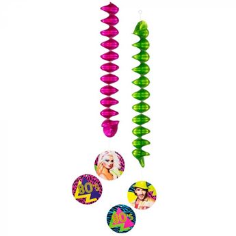 2 Decorados de plástico brillante con forma de espiral y con elegantes siluetas de temática Años 80. Van en pack de 2 unidades. Miden aprox 60cm