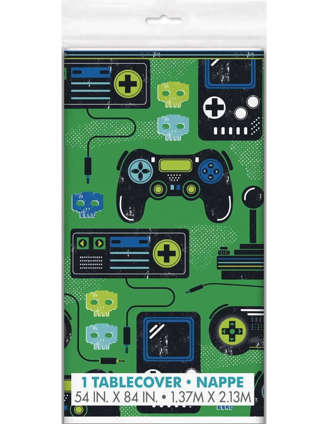 Mantel de plástico con un dibujo y diseño para los Fanáticos de los Videojuegos. Es perfecto para decorar la mesa. Original y divertido. Mide aprox 137cm x 213cm