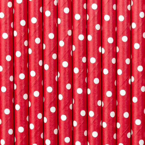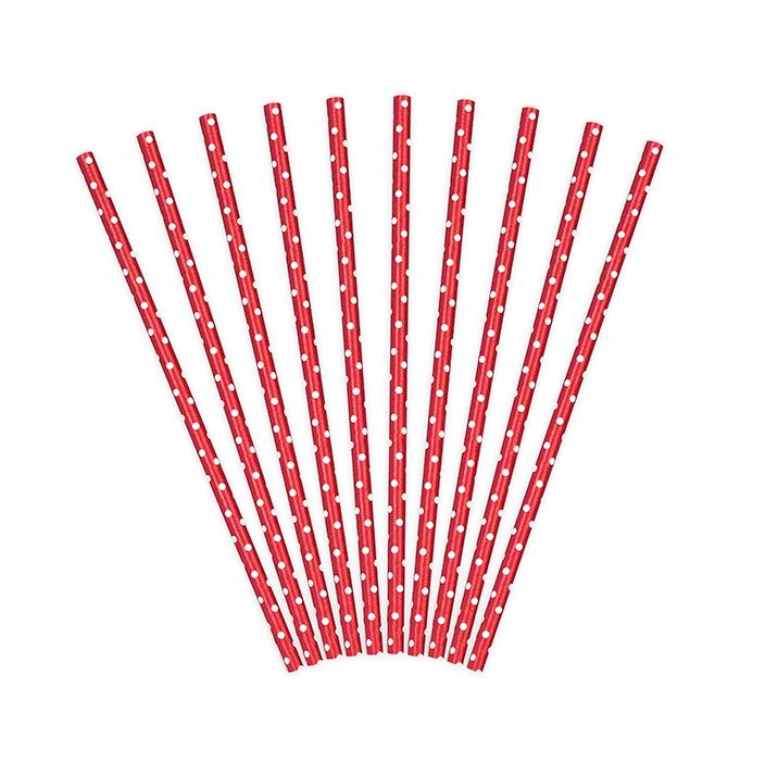 10 pajitas de papel de color rojo con puntos blancos. Divertidas pajitas para fiestas y eventos. Contiene 10 unidades. Miden aprox 19.5cm