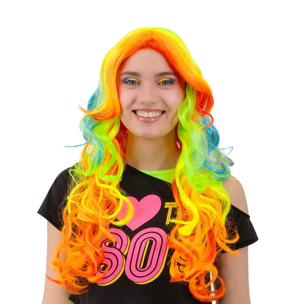 Peluca multicolor de pelo largo y rizado diseñada para completar disfraces y looks de fiesta con un resultado llamativo y divertido. Es una opción práctica para carnavales, fiestas temáticas, eventos de los años 80, festivales y celebraciones donde el color es protagonista.