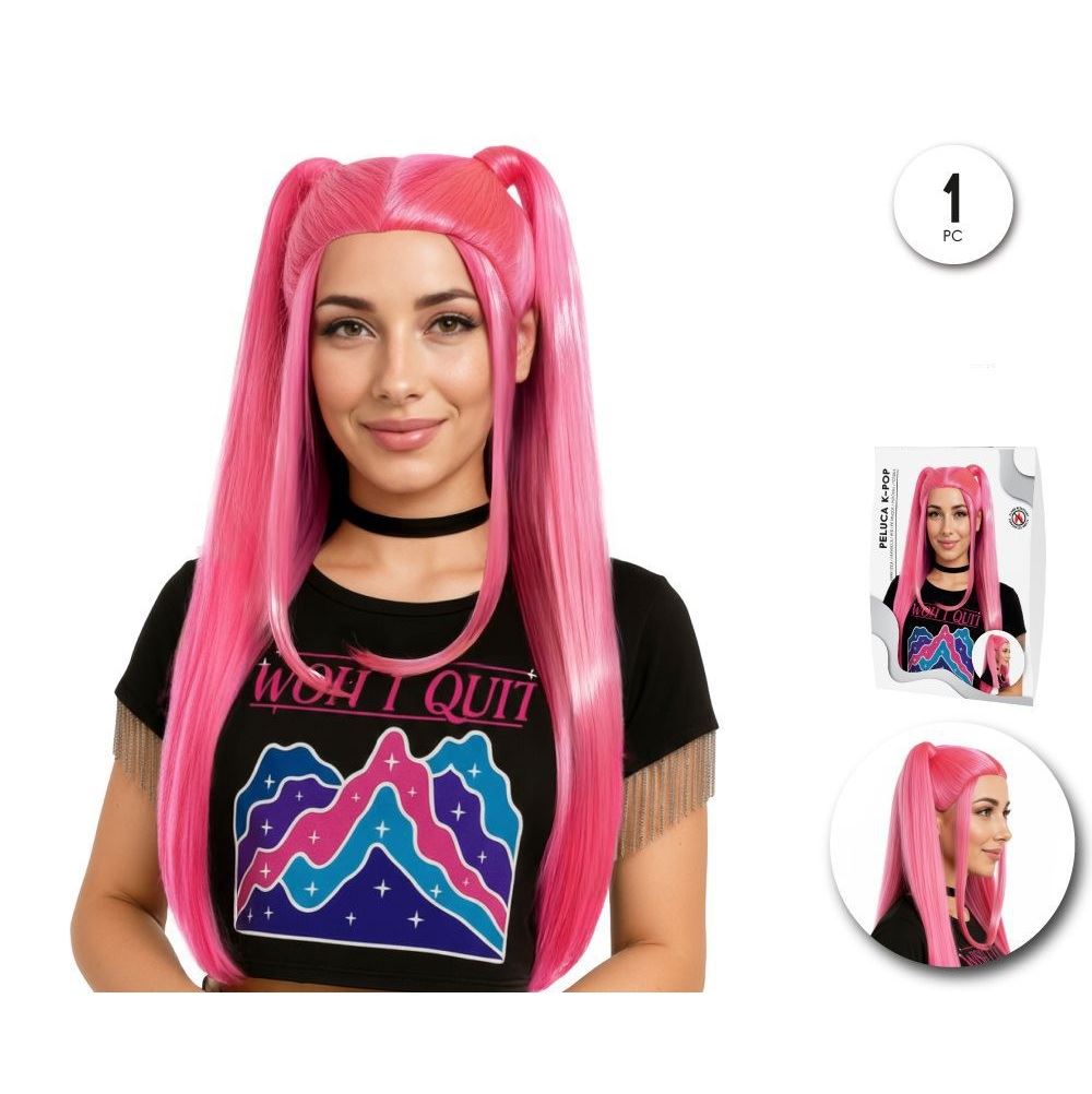 Esta peluca destaca por su color rosa intenso y sus dos coletas altas, un estilo inspirado en la estética pop coreana, el cosplay y los disfraces de anime o personajes futuristas.