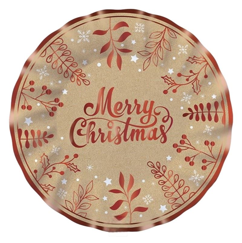 Platos kraft navideños de 25 cm con diseño “Merry Christmas”. Resistentes, cálidos y perfectos para entrantes, postres y mesas de Navidad con estilo.