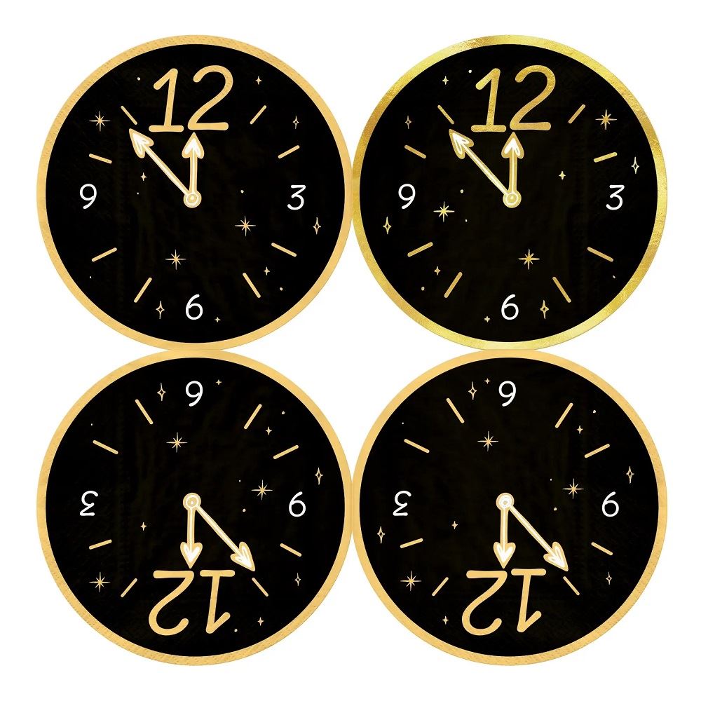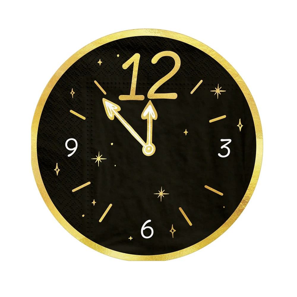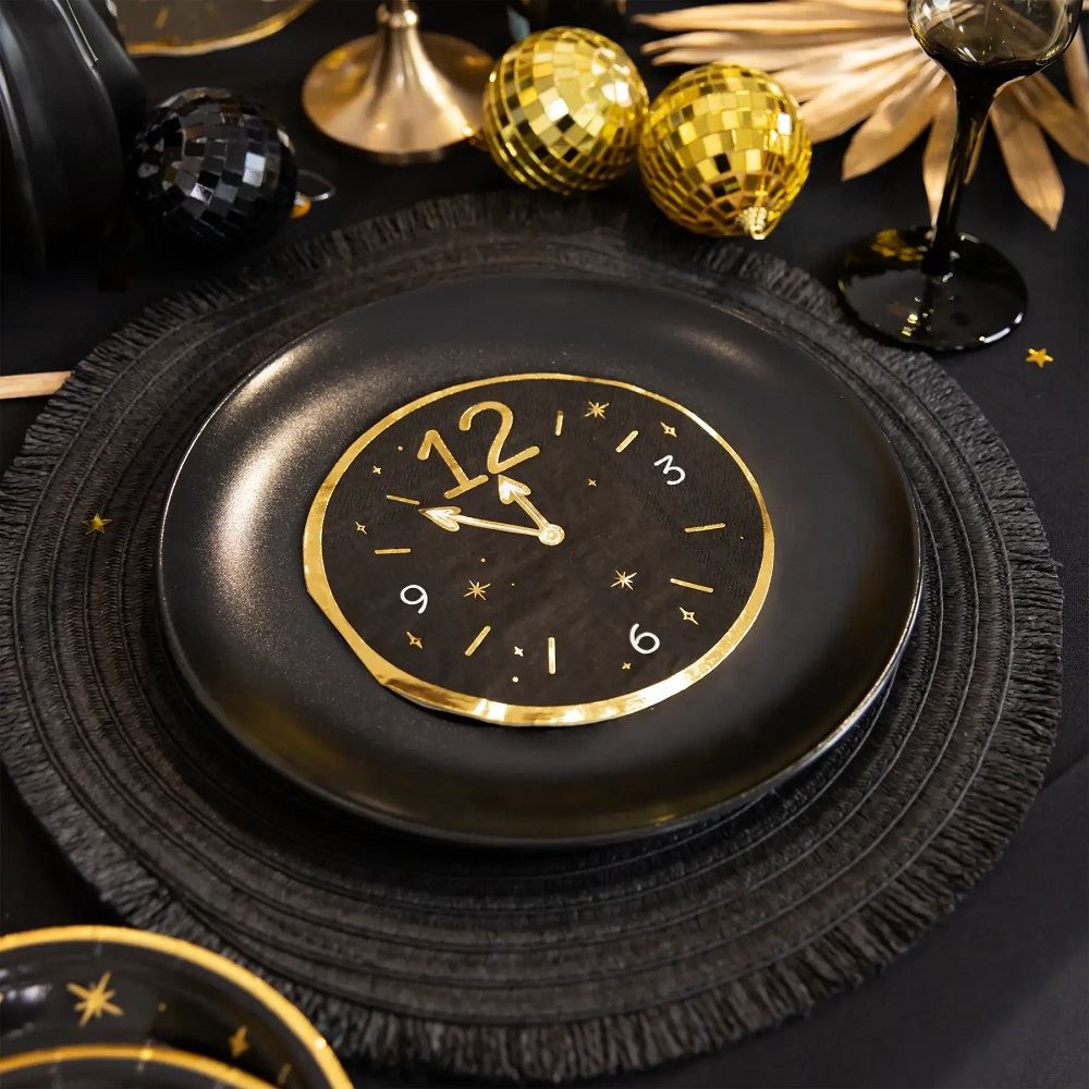 Estas servilletas con diseño de reloj en negro y dorado son perfectas para fiestas de Nochevieja y celebraciones de Año Nuevo. El motivo del reloj a punto de marcar las doce aporta un toque festivo y elegante a la mesa, combinando con decoraciones brillantes y ambientes glamour.