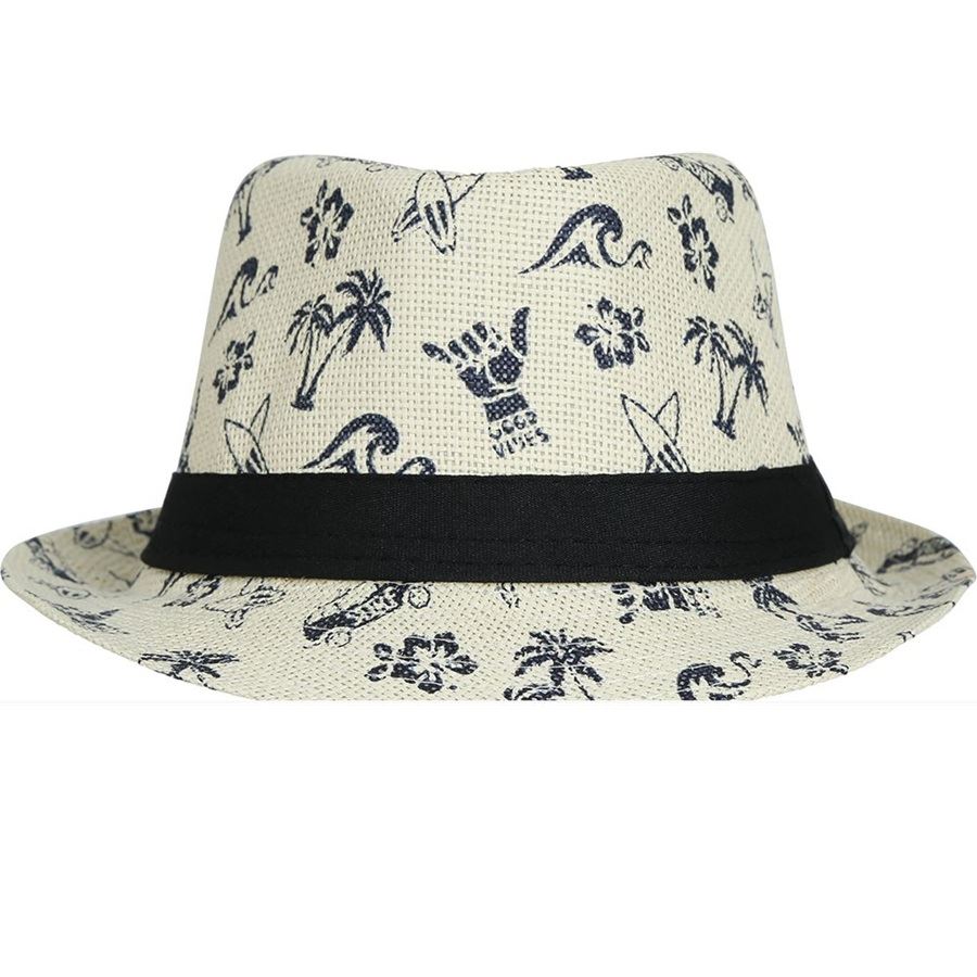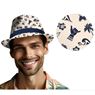 Sombrero Tropical para Hombre – Estampado Azul “Good Vibes” (Adulto) ¡Luce relajado, tropical y con buen rollo con este sombrero de fiesta para hombre con estampado hawaiano y mensaje “Good Vibes”! Con un diseño en color crema y motivos en azul marino como palmeras, hibiscos, olas, tablas de surf y el icónico gesto surfero, es ideal para fiestas en la playa, cumpleaños de verano o despedidas temáticas. Con banda azul a juego, este sombrero de estilo fedora es ligero, fresco y cómodo, perfecto para disfrutar del sol sin perder el estilo.