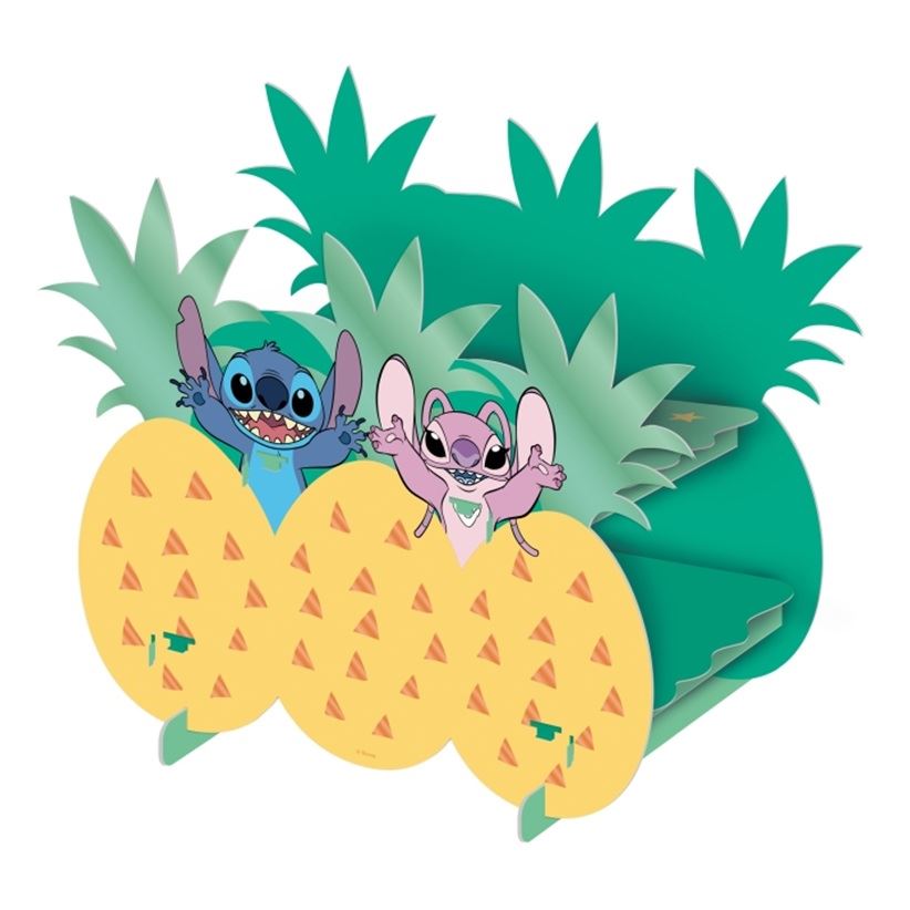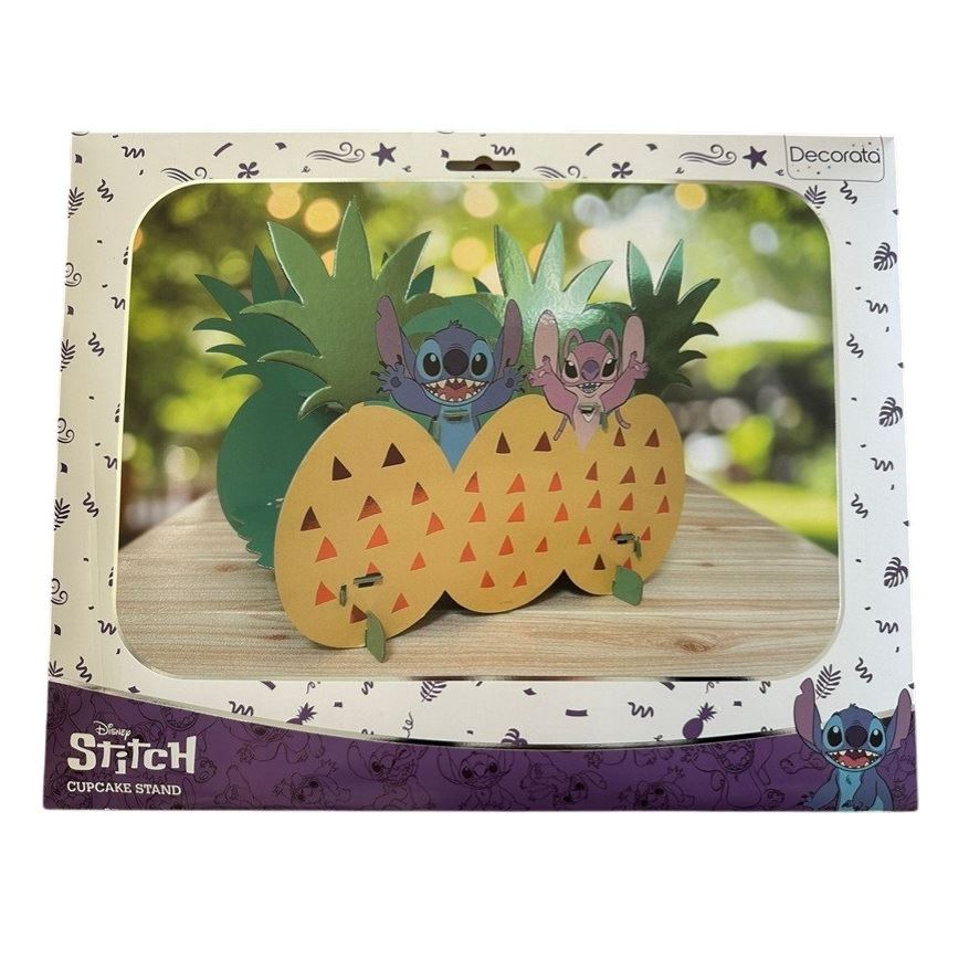 El soporte para dulces Stitch y Angel es un expositor decorativo perfecto para presentar cupcakes, dulces, chuches o pequeños postres en fiestas infantiles. Su diseño tropical con piñas y los personajes Stitch y Angel lo convierte en una pieza llamativa ideal para decorar mesas de cumpleaños.