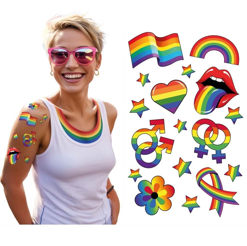 La hoja de tatuajes temporales Pride incluye varios diseños con temática arcoíris, ideales para fiestas, eventos, celebraciones del Orgullo y festivales. Son tatuajes decorativos fáciles de aplicar, pensados para personalizar el look de forma divertida y sin compromiso.