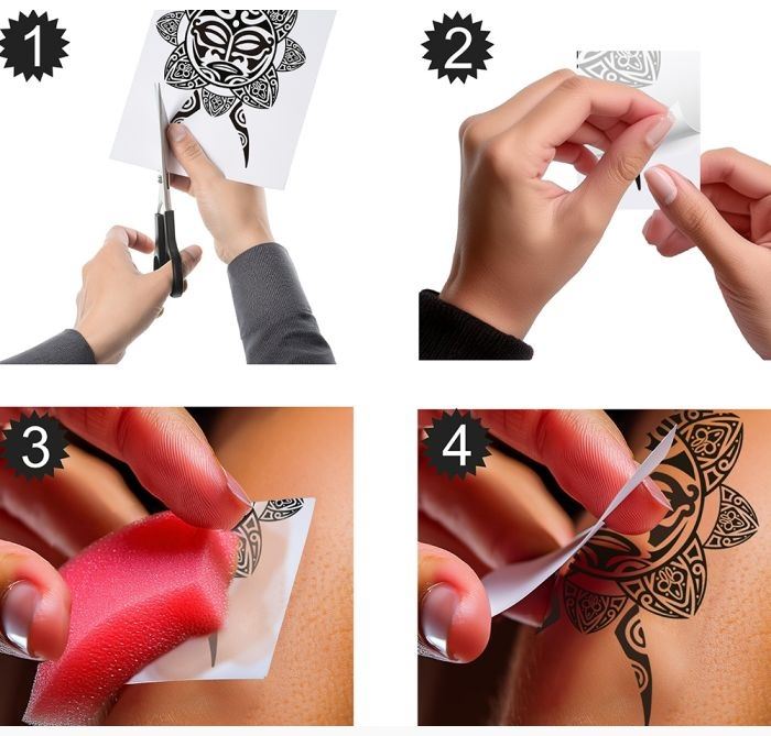 Recorta el diseño, colócalo sobre la piel limpia y seca, humedece con agua durante unos segundos y retira el papel. Para eliminarlos, usa agua tibia con jabón o aceite corporal.