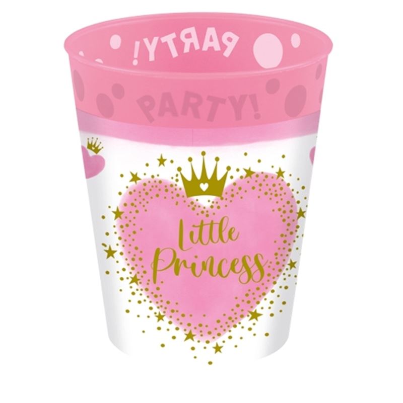 El Vaso Plástico Reutilizable 250 ml Little Princess es perfecto para fiestas temáticas de princesa y cumpleaños infantiles. Su diseño dulce y elegante combina fondo rosa con un gran corazón central y la frase Little Princess en dorado, acompañado de una corona y detalles de estrellas.