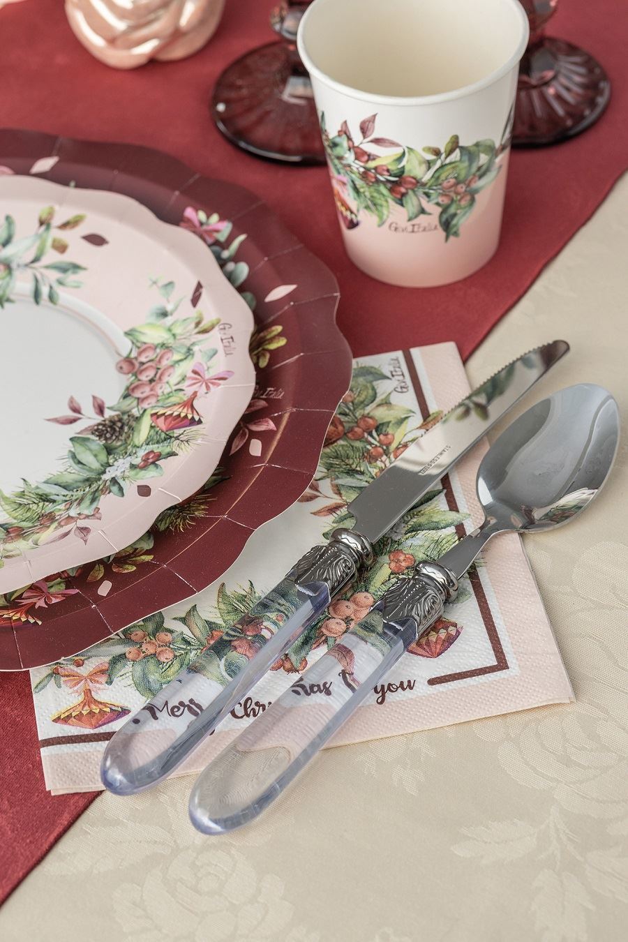 Estos platos de 21 cm son perfectos para entrantes, postres o meriendas festivas, y forman parte de la colección coordinada Christmas Botanical, junto al modelo burdeos de 27 cm. Fabricados en cartón resistente y reciclable, combinan sostenibilidad y belleza para una mesa navideña impecable.