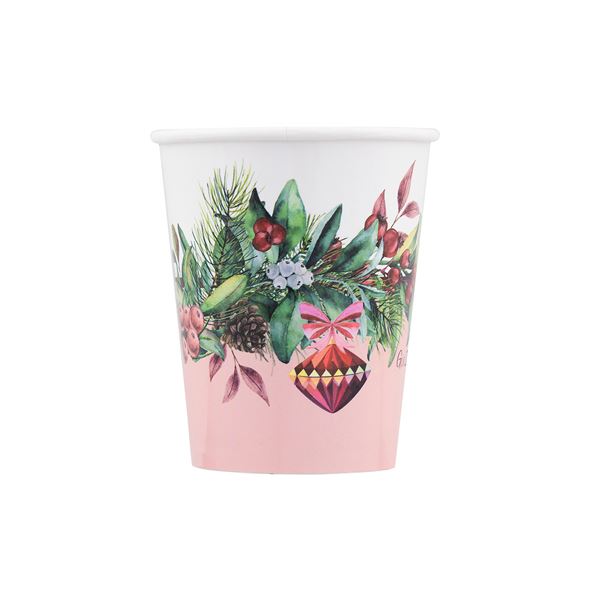 Vasos Cerezas Navidad. Elegancia Festiva en Cartón. Estos 8 vasos de cartón Cerezas Navidad están diseñados para aportar un toque de elegancia a tus celebraciones navideñas. Su color blanco contrasta bellamente con un ribete en tono cereza y rosa y detalles florales, añadiendo un encanto especial a tu mesa festiva. Estos platos son ideales para servir tus deliciosos platillos navideños con un toque de sofisticación. Capacidad 250cc