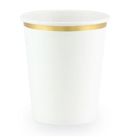 Vasos de papel en color blanco con bordes dorados metálicos, un precioso vaso para darle un bonito toque a tu mesa, para cumpleaños infantiles, baby shower, solo para bebidas frías. Medida aprox 260ml.