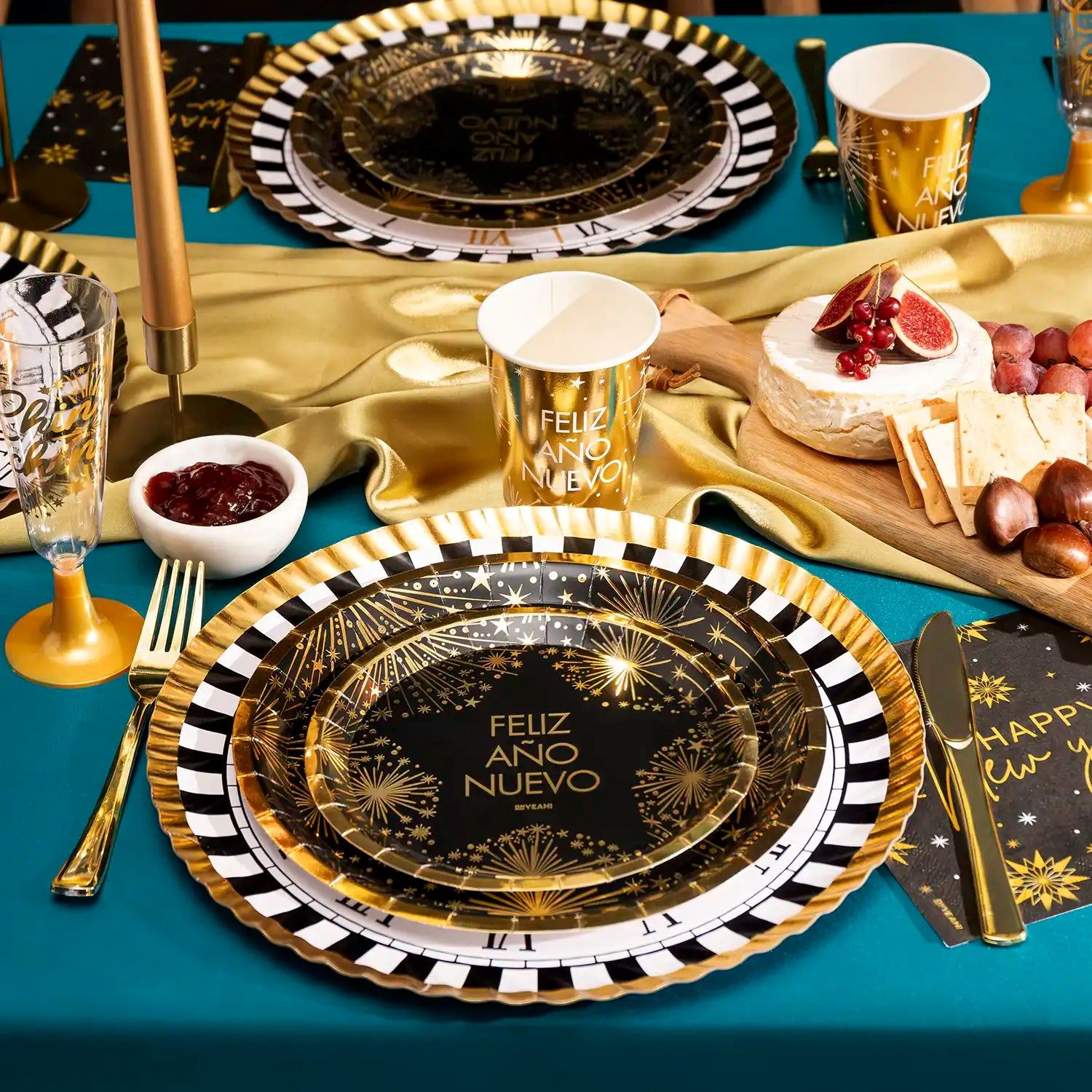 Vasos de cartón de alta calidad de diseño italiano de color negro con puntos dorados y la frase la frase "Happy New Year" en tono dorado que hace que el plato quede muy elegante en la mesa de fin de año o en la comida de año nuevo y les encante a tus invitados y familiares. 250ml. 8 vasos