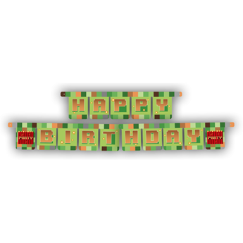 Guirnalda de cartón con la frase Happy Birthday con un diseño de MINECRAFT. Para decorar tu fiesta de Videojuegos. Que chulo te va a quedar todo. Miden aprox 3 metros.