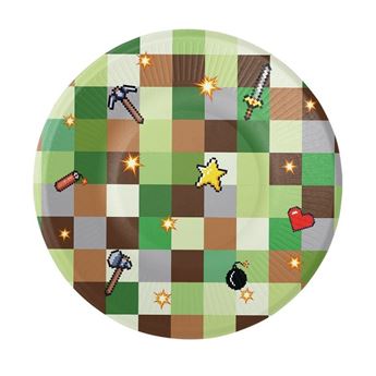 Paquete de 8 platos con un diseño pixelado del videojuego Minecraft. Perfectos para una Fiesta Minecraft. Miden aprox. 23cm