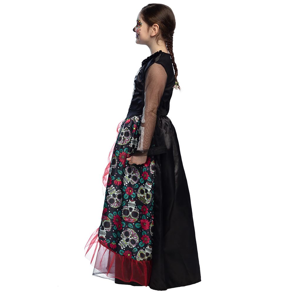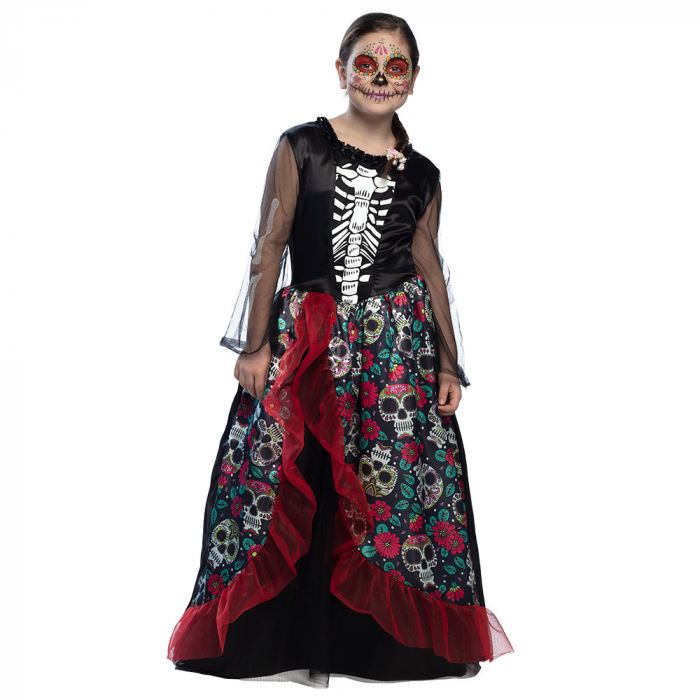 Celebra Halloween o el Día de los Muertos con estilo y elegancia con este disfraz de Catrina de lujo para niña, diseñado para resaltar con su combinación de colores vivos, detalles florales y un toque misterioso. Perfecto para niñas de 10 a 12 años, este vestido logra el equilibrio ideal entre lo tradicional y lo festivo. El disfraz incluye un vestido largo con estampado de calaveras y flores, un corpiño negro con diseño de esqueleto y una falda con volantes en tul rojo, que aporta volumen y movimiento. Ideal para fiestas escolares, desfiles o celebraciones familiares.