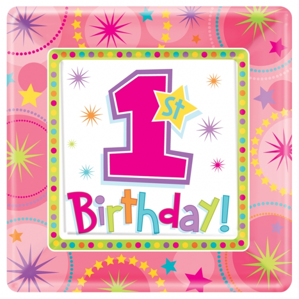 Platos de cartón grandes de 26cm cuadrados con un ilustraciones de un añito. Un plato que sirve como bandeja. Decora tu mesa en su primer cumpleaños con estos platos tan originales y bonitos. Miden 26cm. El pack contiene 8 unidades.