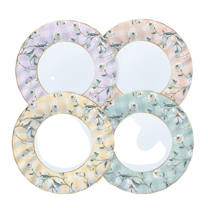 ✅ Diseño elegante: Con flores delicadas y un borde en cuadros vichy, estos platos aportan un toque vintage chic a cualquier mesa. ✅ Colores pastel variados: Cada pack incluye 4 modelos diferentes en tonos lila, verde menta, melocotón y beige suave. ✅ Tamaño práctico: Su diámetro de 25 cm es ideal para platos principales o buffets. ✅ Resistentes y ecológicos: Fabricados en cartón de alta calidad, son reciclables y respetuosos con el medio ambiente.