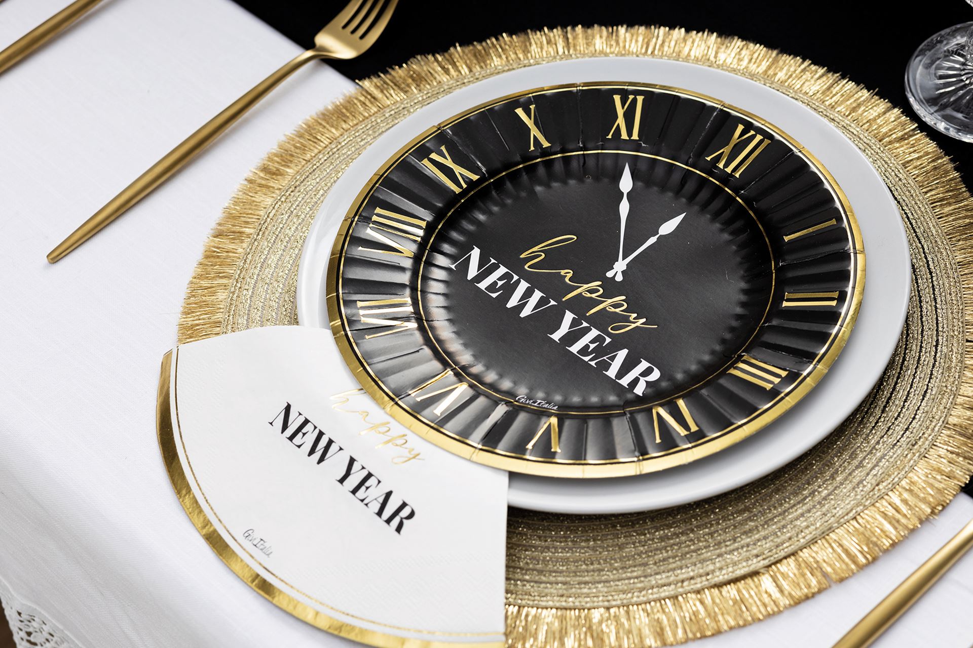 Prepara tu fiesta de fin de año con estos platos desechables para Año Nuevo, diseñados para añadir elegancia y estilo a tu mesa. Este pack de 8 platos de cartón incluye dos modelos con temática de reloj: uno en fondo negro y otro en blanco, ambos decorados con detalles dorados y la frase "Happy New Year". Son perfectos para servir las tradicionales uvas, aperitivos o postres en tu celebración de Nochevieja.