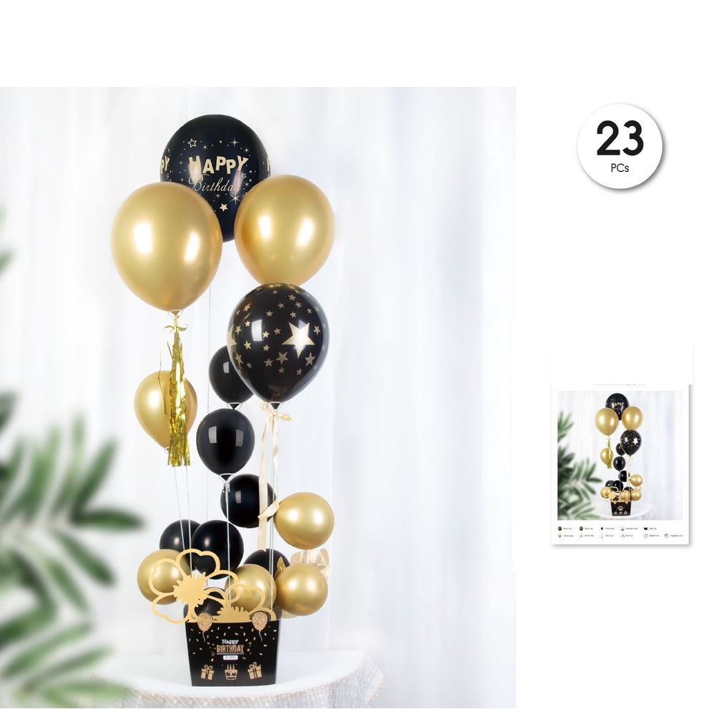 Caja decorativa con globos “Happy Birthday” en negro y dorado. Contiene 23 piezas para armar una decoración impactante en minutos. ¡Ideal para cumpleaños elegantes y detalles únicos!