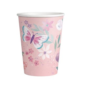 8 Vasos de cartón con diseño floral. Estos vasos quedan muy bien con nuestros platos y servilletas de papel de hadas mariposas flores para crear un ambiente mágico de cuento de hadas. Cada paquete contiene 8 vasos de cartón. 266ml