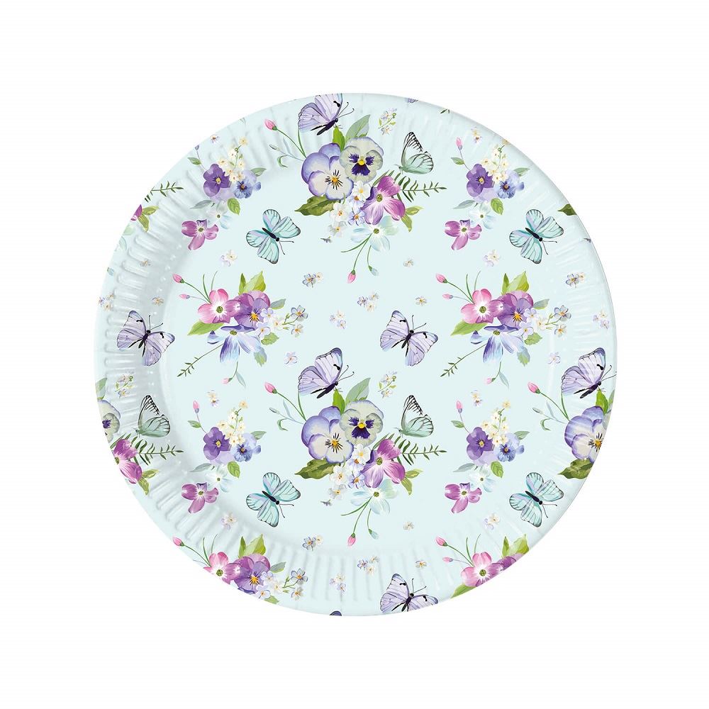 Platos de cartón con un diseño de Mariposas con Flores en tono turquesa. Para cumpleaños y celebraciones especiales. Medida 20cm plato de postre. Vienen 8 unidades. Platos FSC