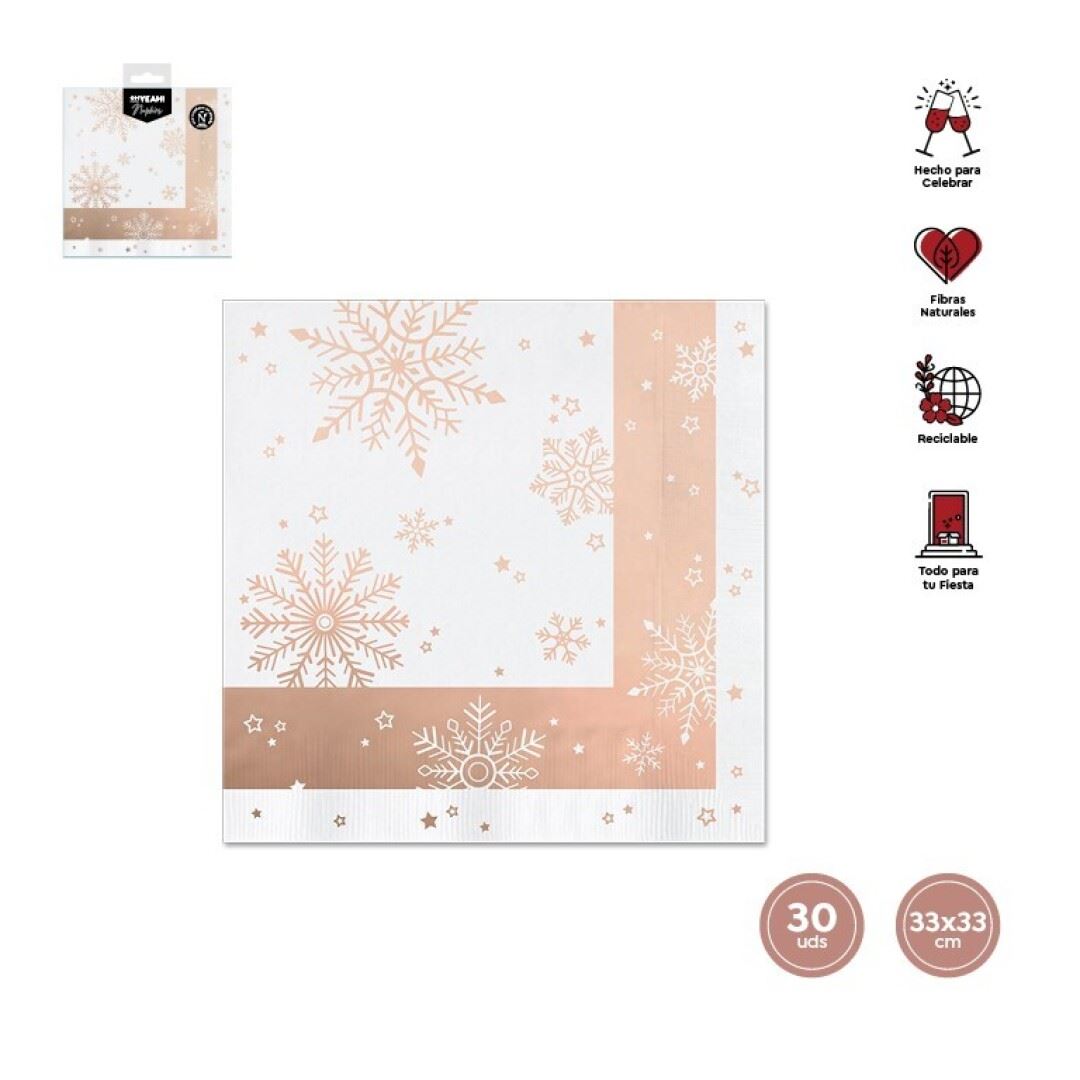 30 Servilletas de papel de color rosa dorado suave con un dibujo de un copo de nieve. Miden 33cm x 33cm.