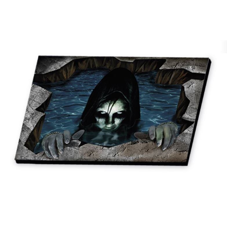 Convierte la entrada de tu casa en el escenario de una película de terror con este felpudo de Halloween con efecto visual de abismo. Su diseño de alta definición presenta a una figura siniestra emergiendo de un pozo, ideal para recibir a tus invitados con un susto inolvidable o decorar fiestas temáticas de miedo.