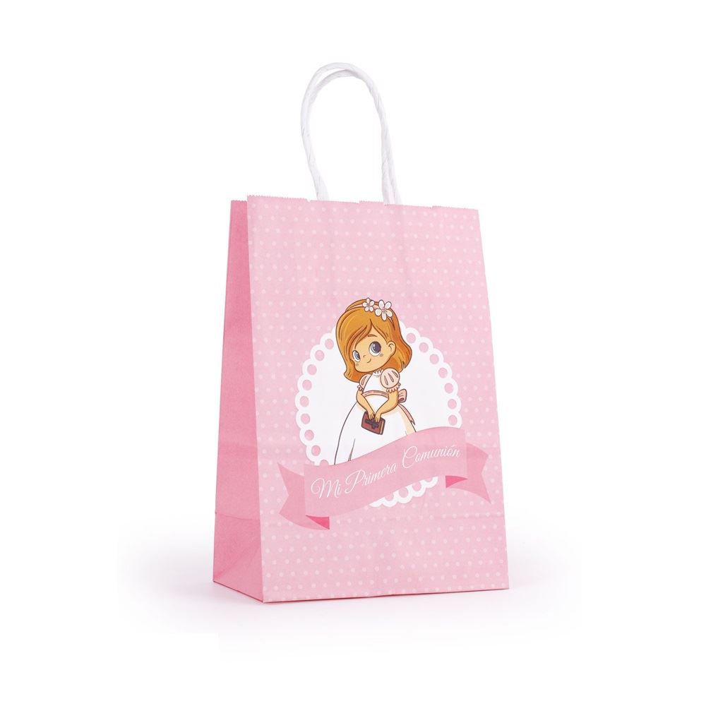 Agrega un toque encantador a la celebración de la primera comunión con nuestra Bolsa Mi Primera Comunión Rosa con Puntos. Esta encantadora bolsa de cartón, diseñada en tonos rosados y decorada con puntos blancos, es el complemento perfecto para guardar recuerdos, regalos o dulces en este día tan especial. Con medidas de 21cm x 16cm y un práctico asa para transportar, esta bolsa combina estilo y funcionalidad para hacer que tu evento sea aún más memorable. ¡Haz que cada detalle cuente en esta ocasión tan significativa!