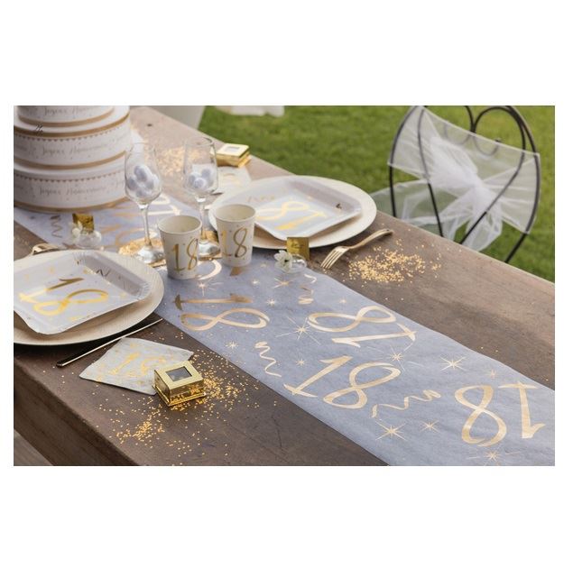 Un complemento imprescindible para decorar la mesa en una fiesta de cumpleaños de 30 años en color blanco con toque dorado. Este camino de mesa de tela de poliester mide 5m de largo y 30cm de ancho.