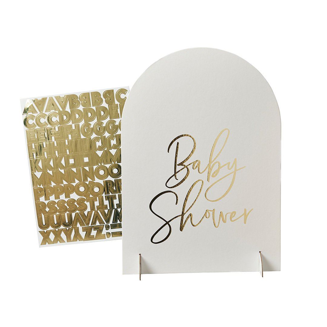 Este cartel "Baby Shower" en tonos blanco y dorado es perfecto para crear un rincón especial en la fiesta, decorar la mesa principal o usar como fondo para fotos. Gracias al set de pegatinas con letras doradas (4 unidades de cada letra de la A a la Z + símbolos), podrás escribir nombres, fechas o frases únicas para un evento inolvidable.